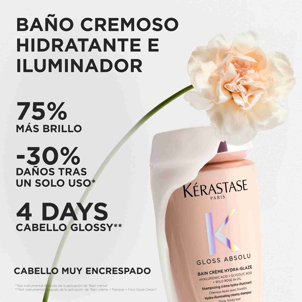 Bain Crème Hydra-Glaze de Kérastase es un baño cremoso hidratante e iluminador para cabello muy encrespado sin sulfatos (sin tensioactivos sulfatados). Está específicamente formulado con ácido hialurónico, ácido glicólico y aceite de rosa silvestre para nutrir intensamente el cabello. Te proporciona un cabello glossy, con brillo y ligero.