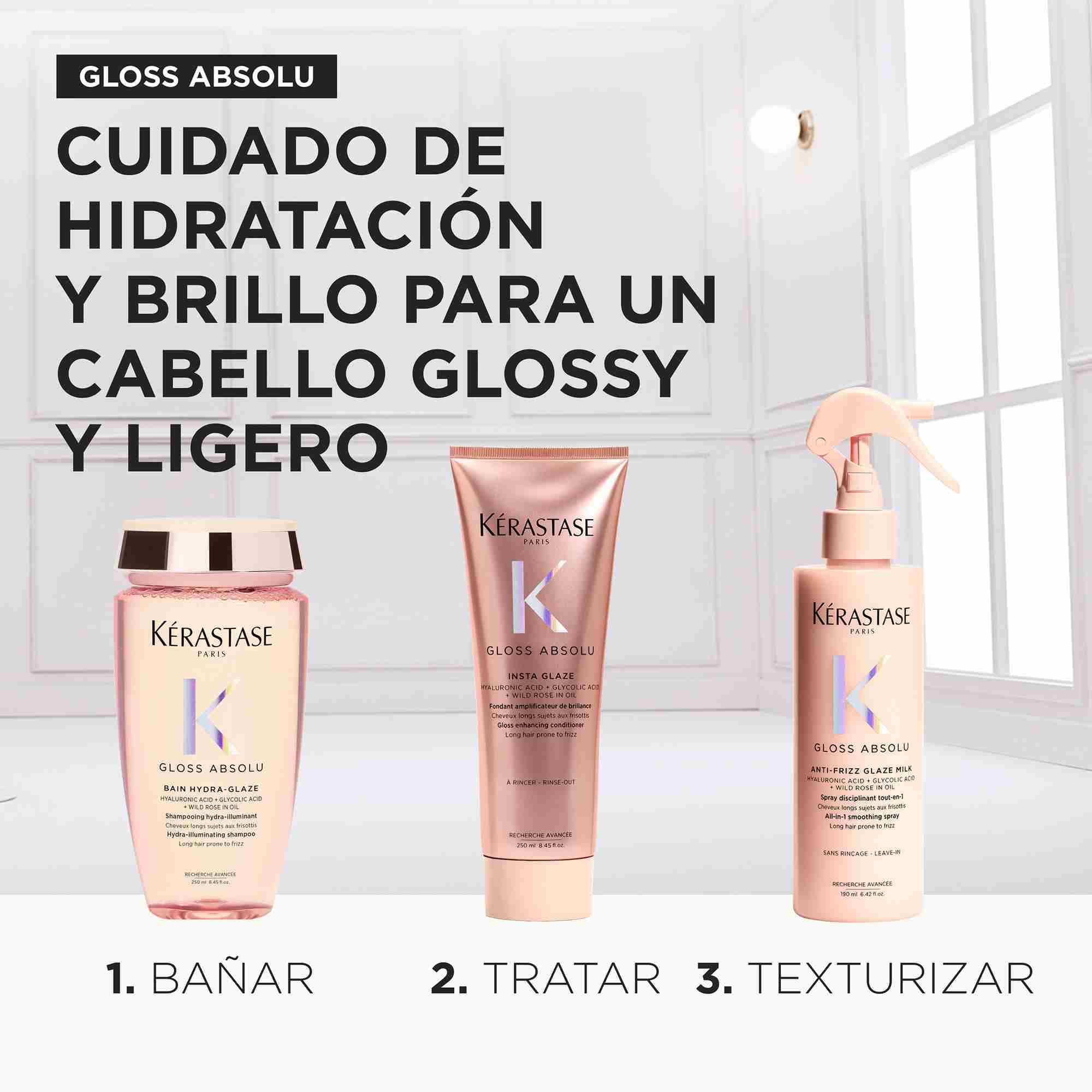 Set de champú, acondicionador y aceite capilar Gloss Absolu de edición limitada para cabello largo propenso al frizz.